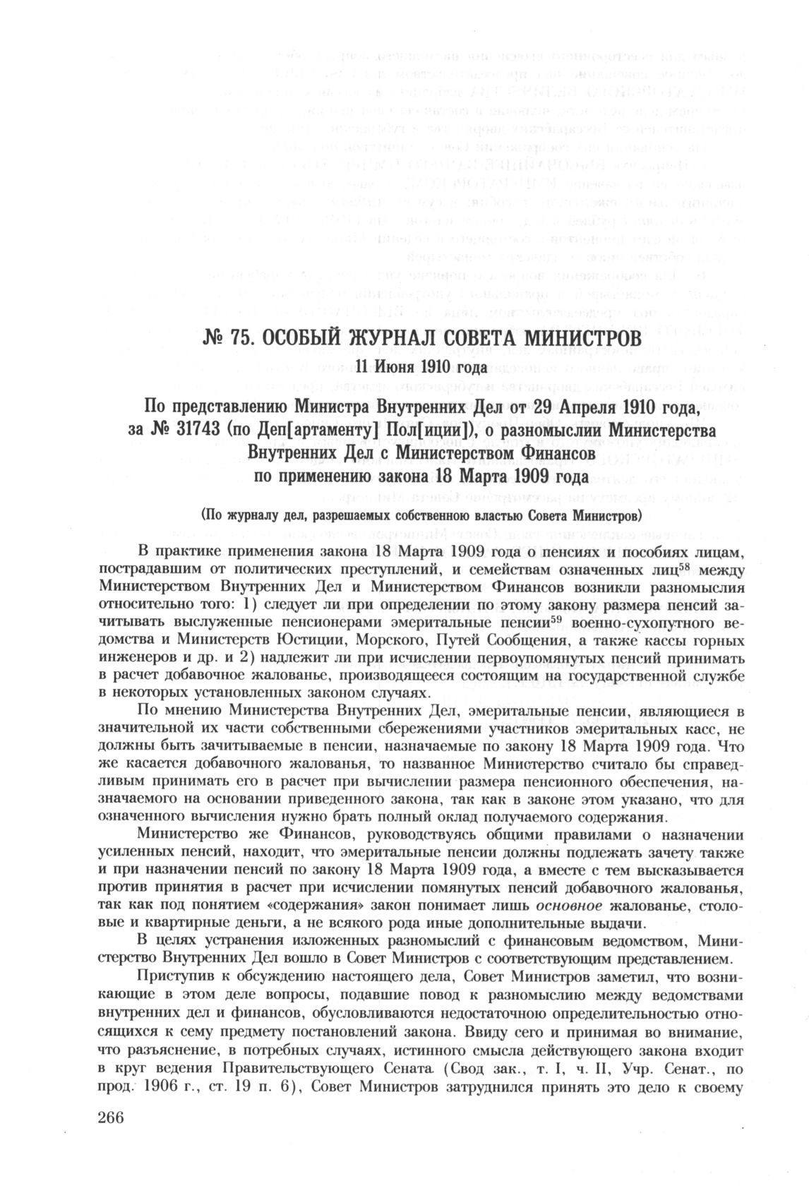 Особый журнал совета министров. 11 Июня 1910 года. По представлению Министра Внутренних Дел от 29 Апреля 1910 года, за № 31743 (по Деп[артаменту] Пол[иции]), о разномыслии Министерства Внутренних Дел с Министерством Финансов по применению закона 1...