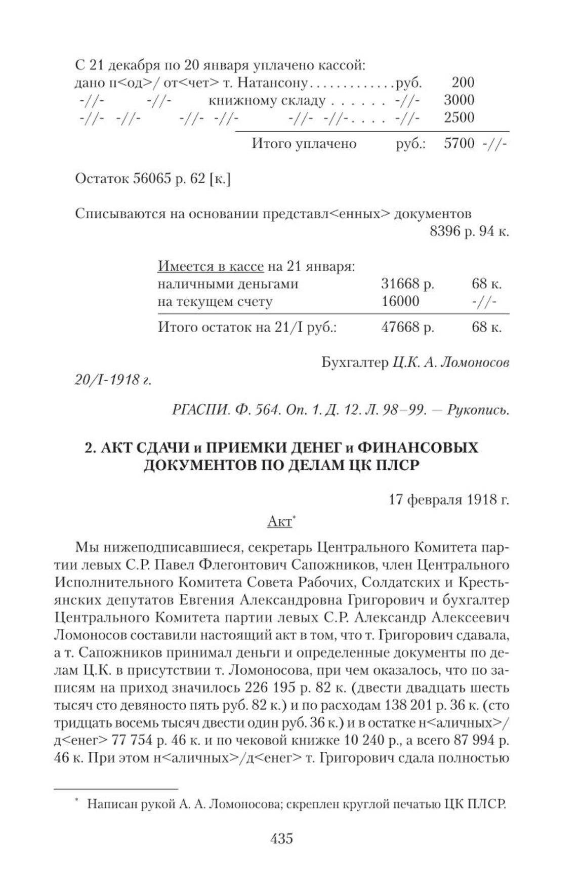 Акт сдачи и приемки денег и финансовых документов по делам ЦК ПЛСР. 17 февраля 1918 г. // РГАСПИ. Ф. 564. Оп. 1. Д. 12. Л. 75. — Рукопись, подписи — автографы.