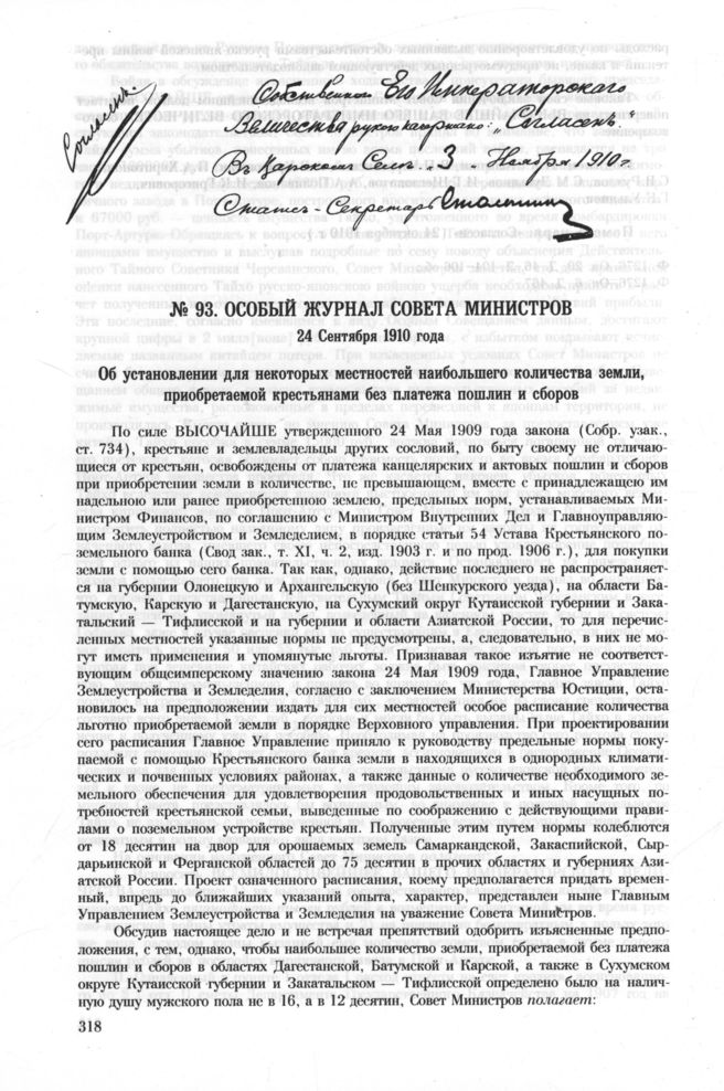 Особый журнал совета министров. 24 Сентября 1910 года. Об установлении для некоторых местностей наибольшего количества земли, приобретаемой крестьянами без платежа пошлин и сборов