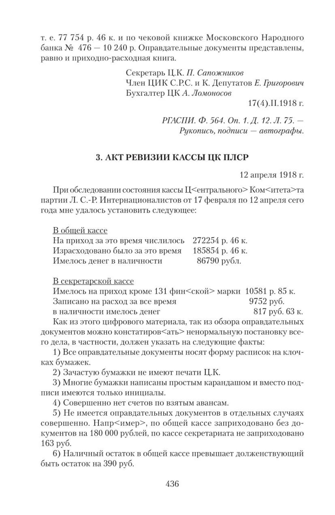 Акт ревизии кассы ЦК ПЛСР. 12 апреля 1918 г. // РГАСПИ. Ф. 564. Оп. 1. Д. 12. Л. 64–65. — Рукопись, подписи — автографы.