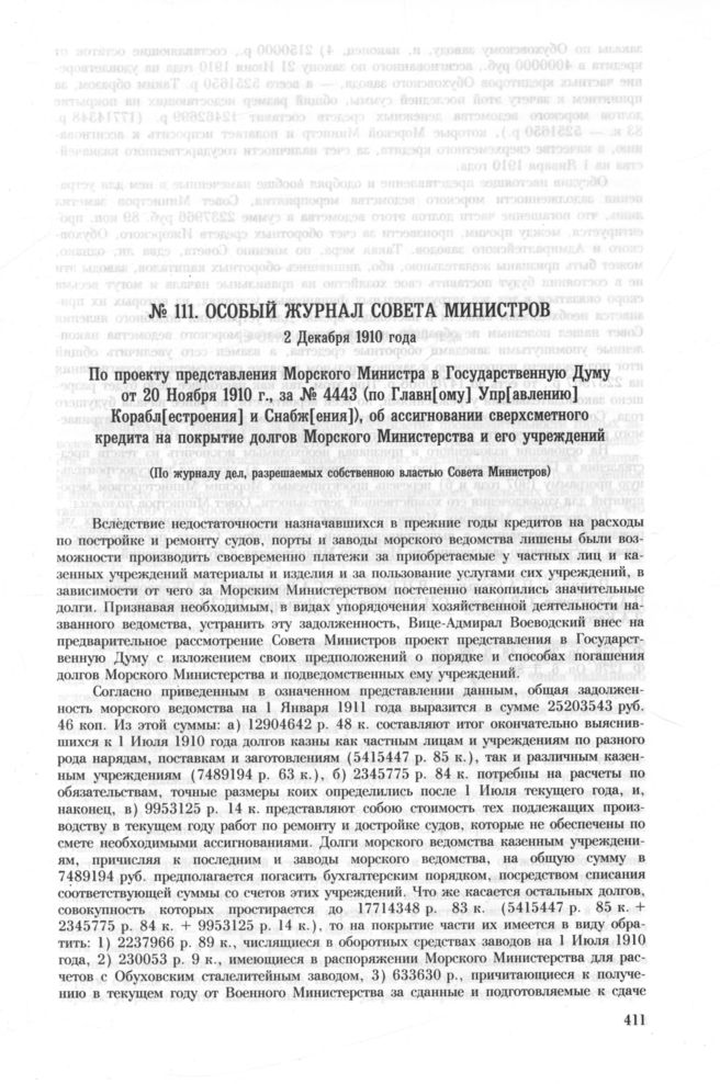 Особый журнал совета министров. 2 Декабря 1910 года. По проекту представления Морского Министра в Государственную Думу от 20 Ноября 1910 г., за № 4443 (по Главн[ому] Упр[авлению] Корабл[естроения] и Снабж[ения]), об ассигновании сверхсметного кредита на покрытие долгов Морского Министерства и его учреждений // РГИА Ф. 1276. Оп. 20. Д. 48. Л. 28-29; Ф. 1276. Оп. 6. Д. 88.