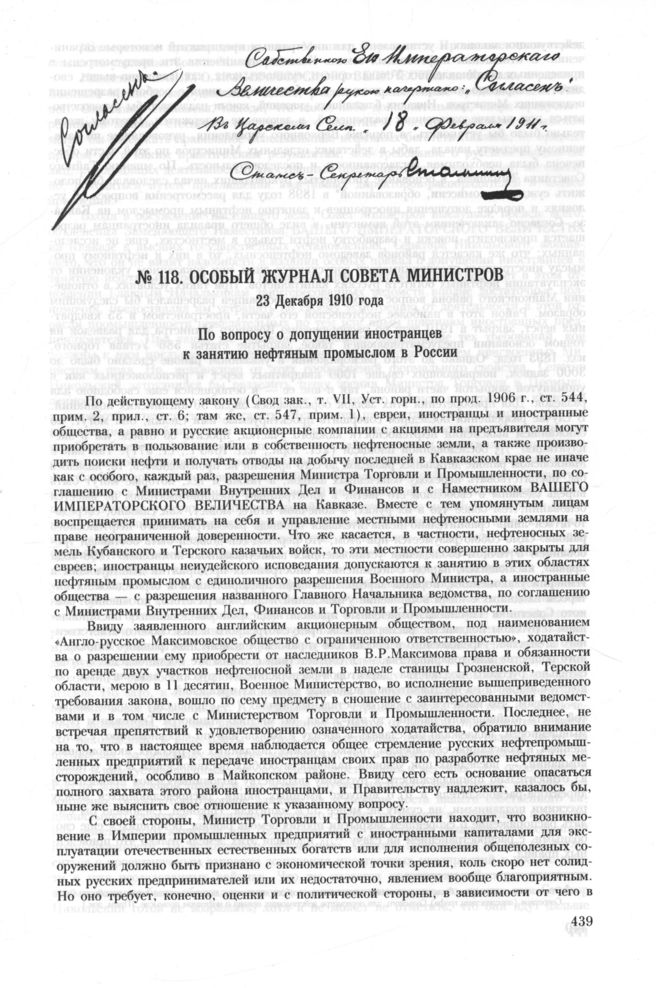 Особый журнал совета министров. 23 Декабря 1910 года. По вопросу о допущении иностранцев к занятию нефтяным промыслом в России // РГИА Ф. 1276. Оп. 20. Д. 48. Л. 136-141; Ф. 1276. Оп. 6. Д. 230.