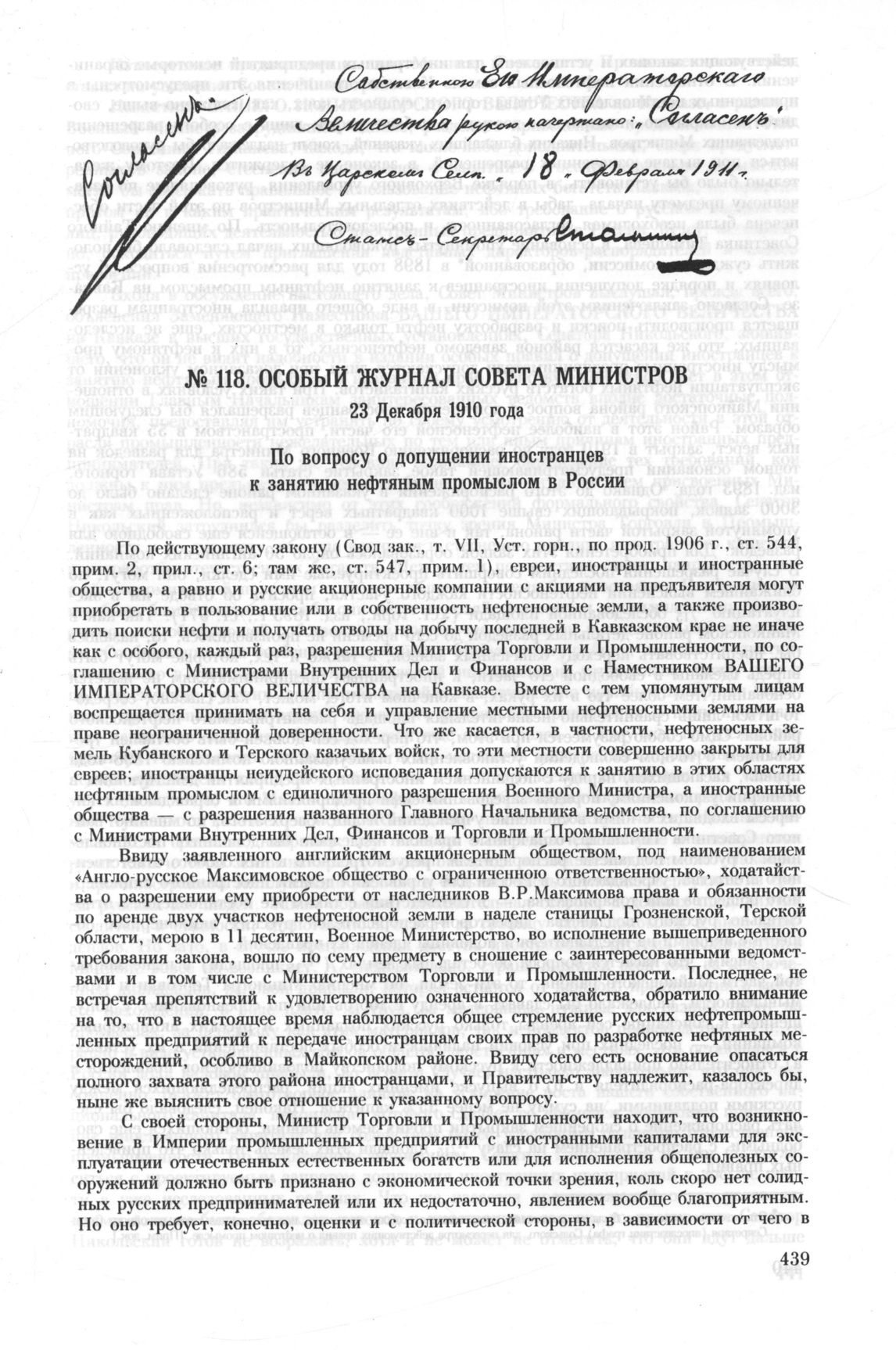 Особый журнал совета министров. 23 Декабря 1910 года. По вопросу о допущении иностранцев к занятию нефтяным промыслом в России