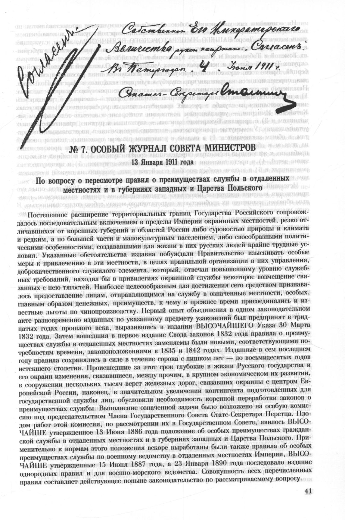 Особый журнал совета министров. 13 Января 1911 года. По вопросу о пересмотре правил о преимуществах службы в отдаленных местностях и в губерниях западных и Царства Польского
