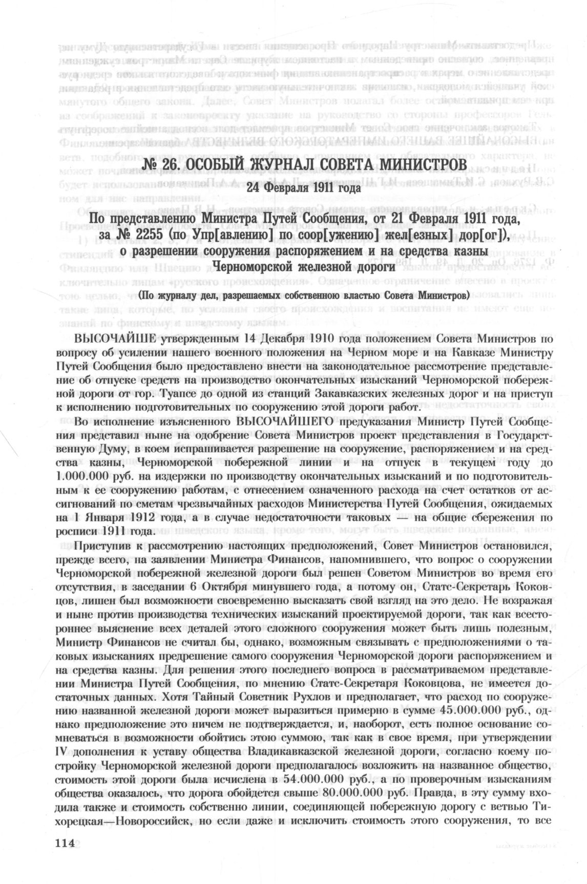 Особый журнал совета министров. 24 Февраля 1911 года. По представлению Министра Путей Сообщения, от 21 Февраля 1911 года, за № 2255 (по Упр[авлению] по соор[ужению] жел[езных] дор[ог]), о разрешении сооружения распоряжением и на средства казны Чер...