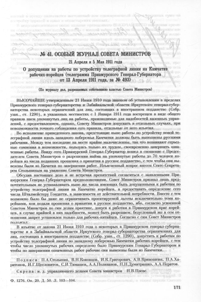 Особый журнал совета министров. 21 Апреля и 5 Мая 1911 года. О допущении на работы по устройству телеграфной линии на Камчатке рабочих-корейцев (телеграмма Приамурского Генерал-Губернатора от 13 Апреля 1911 года, за № 493)