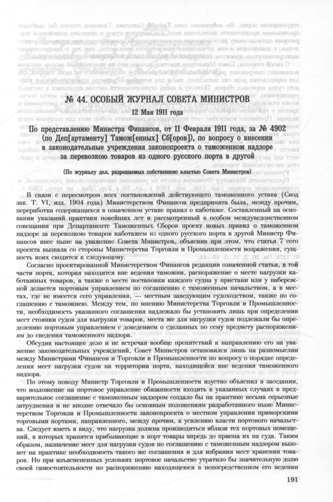 Особый журнал совета министров. 12 Мая 1911 года. По представлению Министра Финансов, от И Февраля 1911 года, за № 4902 (по Деп[артаменту] Тамож[енных] Сб[оров]), по вопросу о внесении в законодательные учреждения законопроекта о таможенном надзоре за перевозкою товаров из одного русского порта в другой // РГИА Ф. 1276. Оп. 20. Д. 51. Л. 43—44; Ф. 1276. Оп. 7. Д. 100.