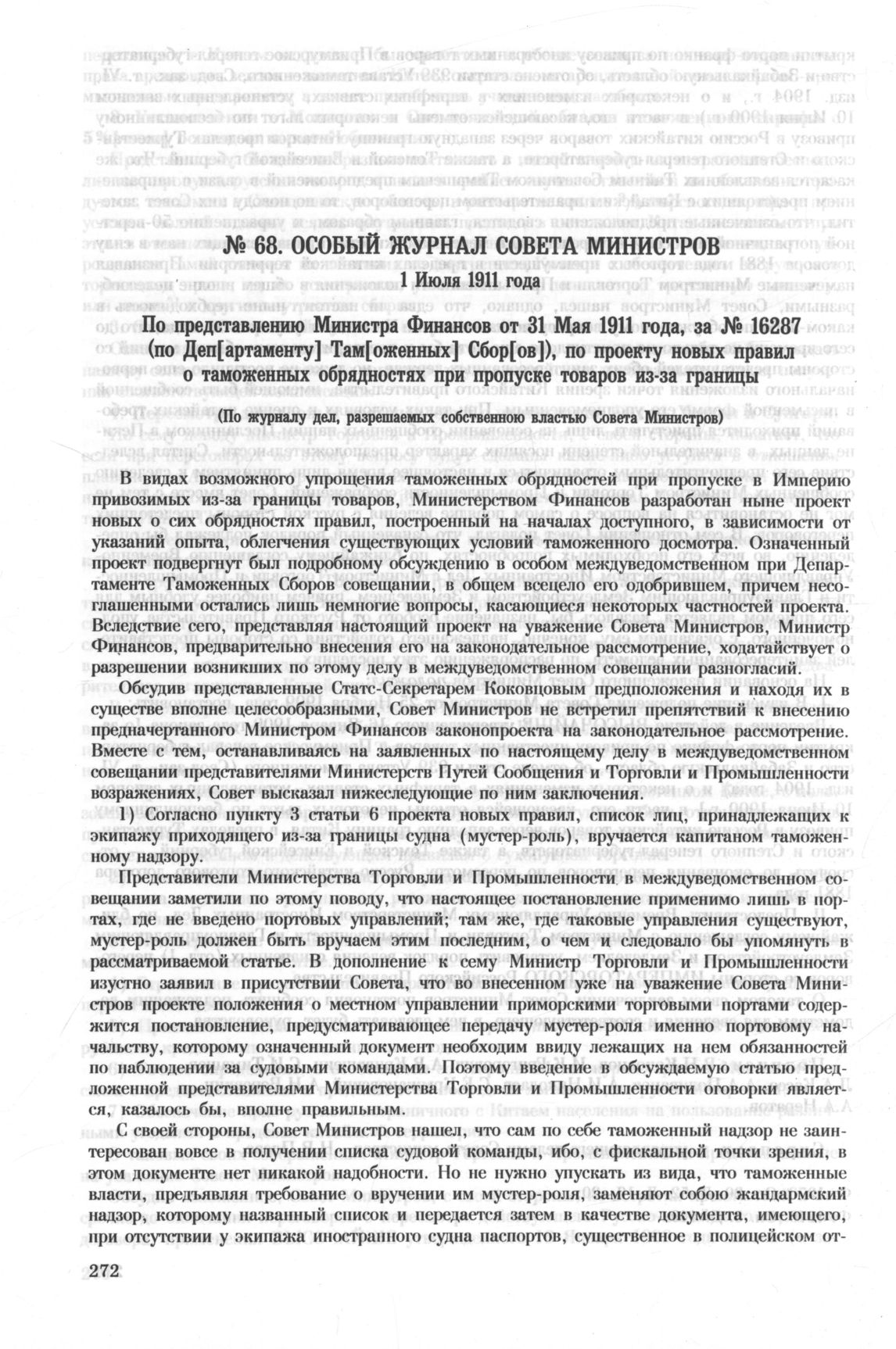 Особый журнал совета министров. 1 июля 1911 года. По представлению Министра Финансов от 31 Мая 1911 года, за № 16287 (по Деп[артаменту] Там[оженных] Сбор[ов]), по проекту новых правил о таможенных обрядностях при пропуске товаров из-за границы