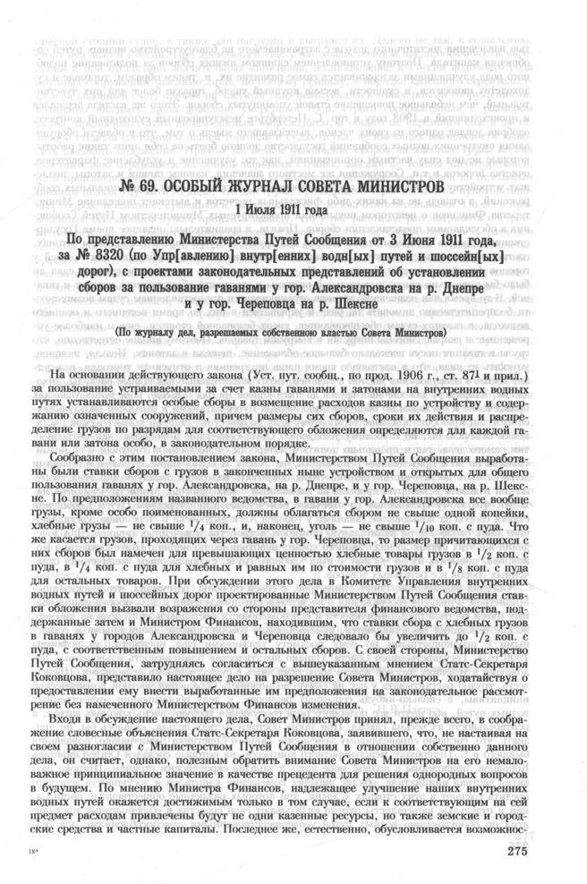 Особый журнал совета министров. 1 июля 1911 года. По представлению Министерства Путей Сообщения от 3 Июня 1911 года, за № 8320 (по Упр[авлению] внутр[енних] водн[ых] путей и шоссейн[ых] дорог), с проектами законодательных представлений об установлении сборов за пользование гаванями у гор. Александровска на р. Днепре и у гор. Череповца на р. Шексне