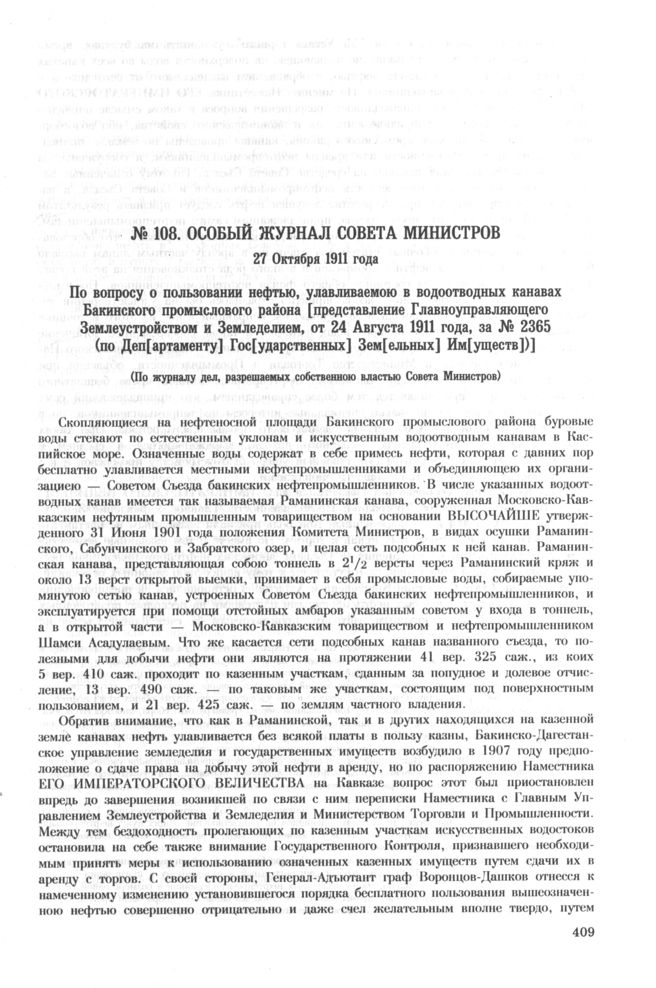 Особый журнал совета министров. 27 Октября 1911 года. По вопросу о пользовании нефтью, улавливаемою в водоотводных канавах Бакинского промыслового района [представление Главноуправляющего Землеустройством и Земледелием, от 24 Августа 1911 года, за № 2365 (по Деп[артаменту] Гос[ударственных] Зем[ельных] Им[уществ])] // РГИА
