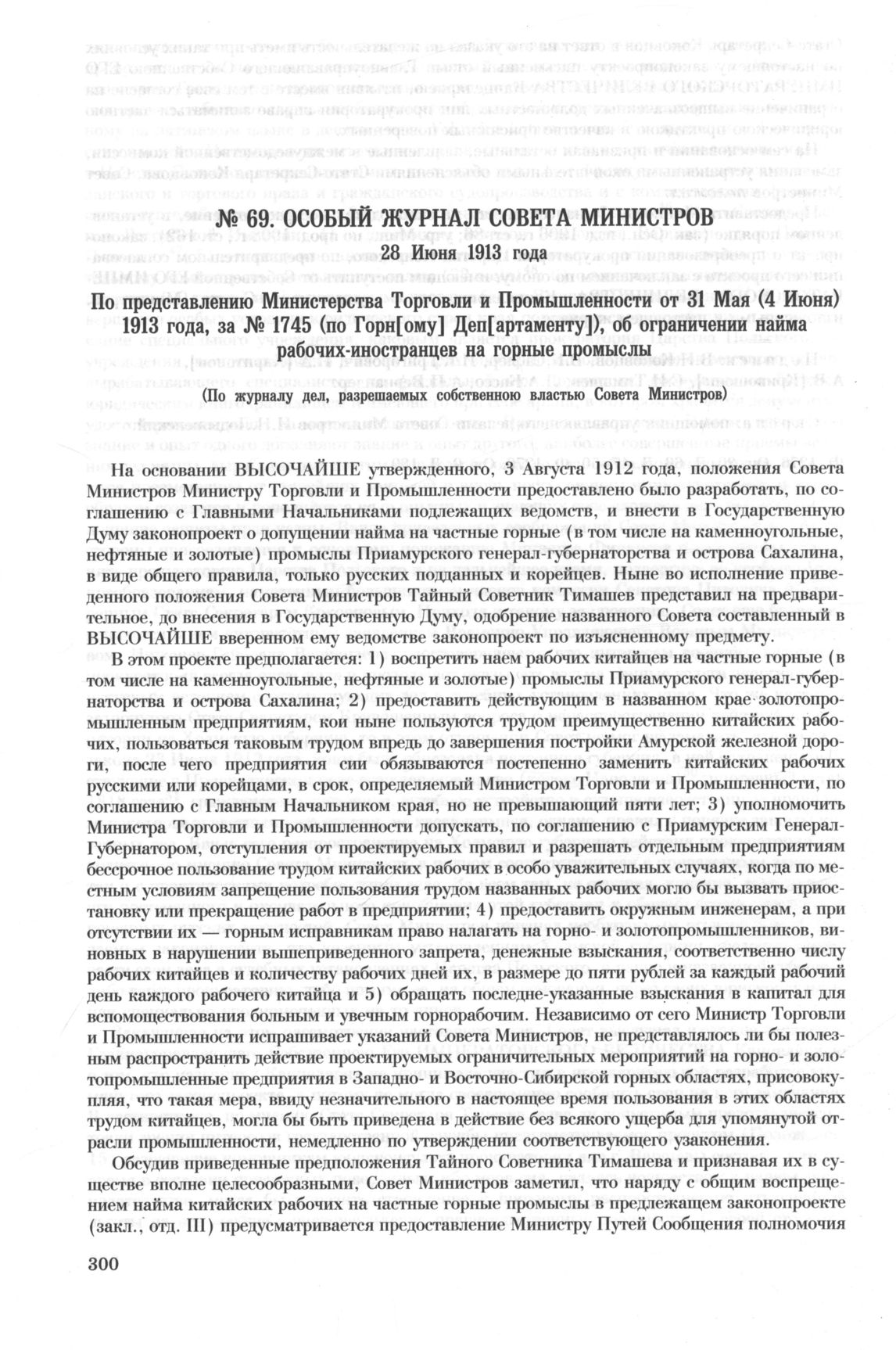 Особый журнал совета министров. 28 Июня 1913 года. По представлению Министерства Торговли и Промышленности от 31 Мая (4 Июня) 1913 года, за № 1745 (по Горн[ому] Деп[артаменту]), об ограничении найма рабочих иностранцев на горные промыслы