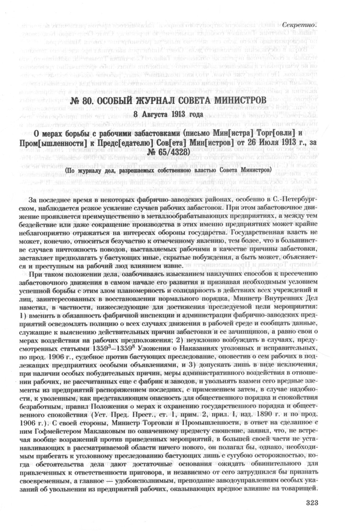 Особый журнал совета министров. 8 Августа 1913 года. О мерах борьбы с рабочими забастовками (письмо Мин[истра] Торг[овли] и Пром[ышленности] к Пред[седателю] Сов[ета] Мин[истров] от 26 Июля 1913 г., за № 65/4328)