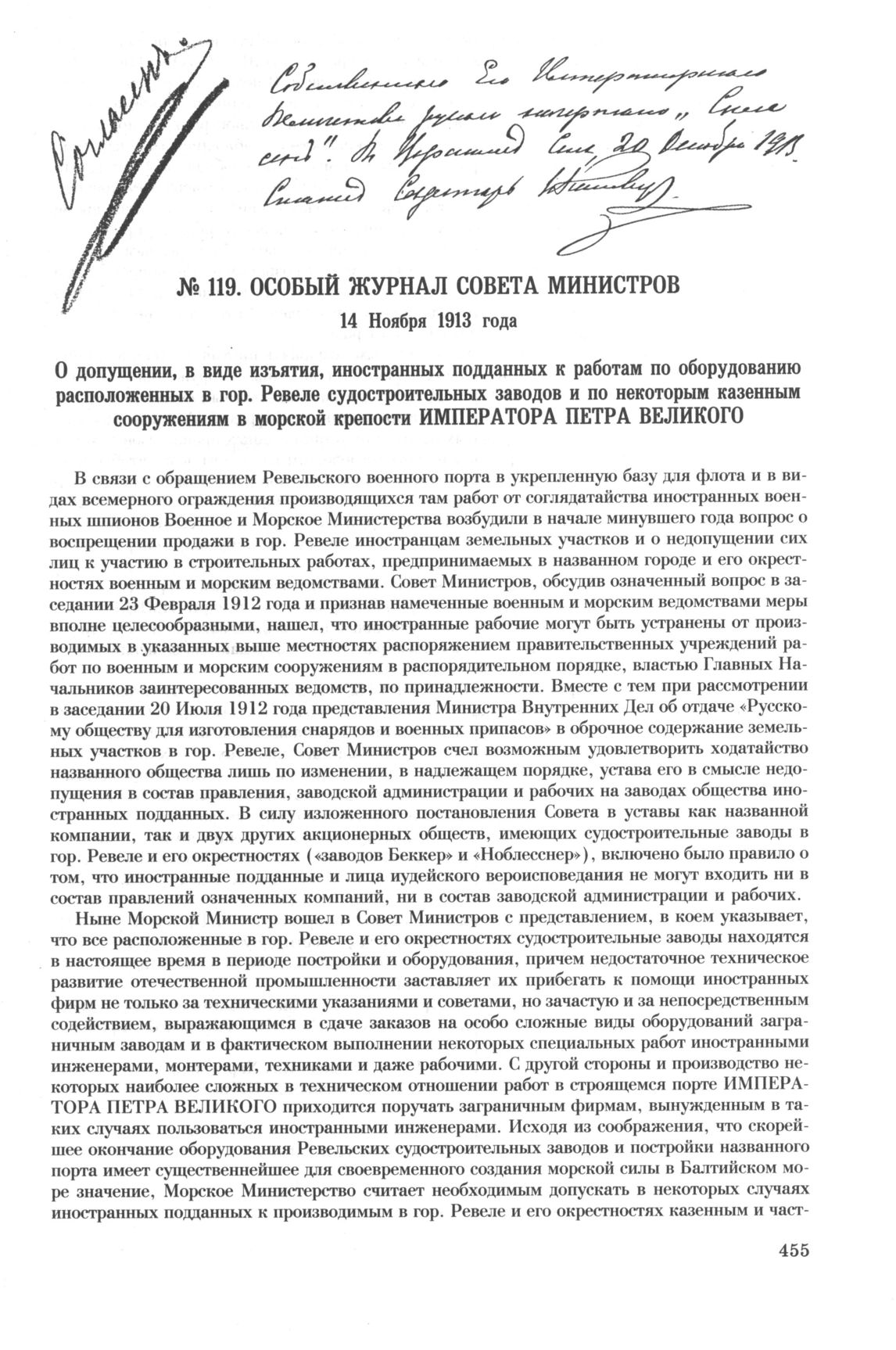Особый журнал совета министров. 14 Ноября 1913 года. О допущении, в виде изъятия, иностранных подданных к работам по оборудованию расположенных в гор. Ревеле судостроительных заводов и по некоторым казенным сооружениям в морской крепости Императора Петра Великого