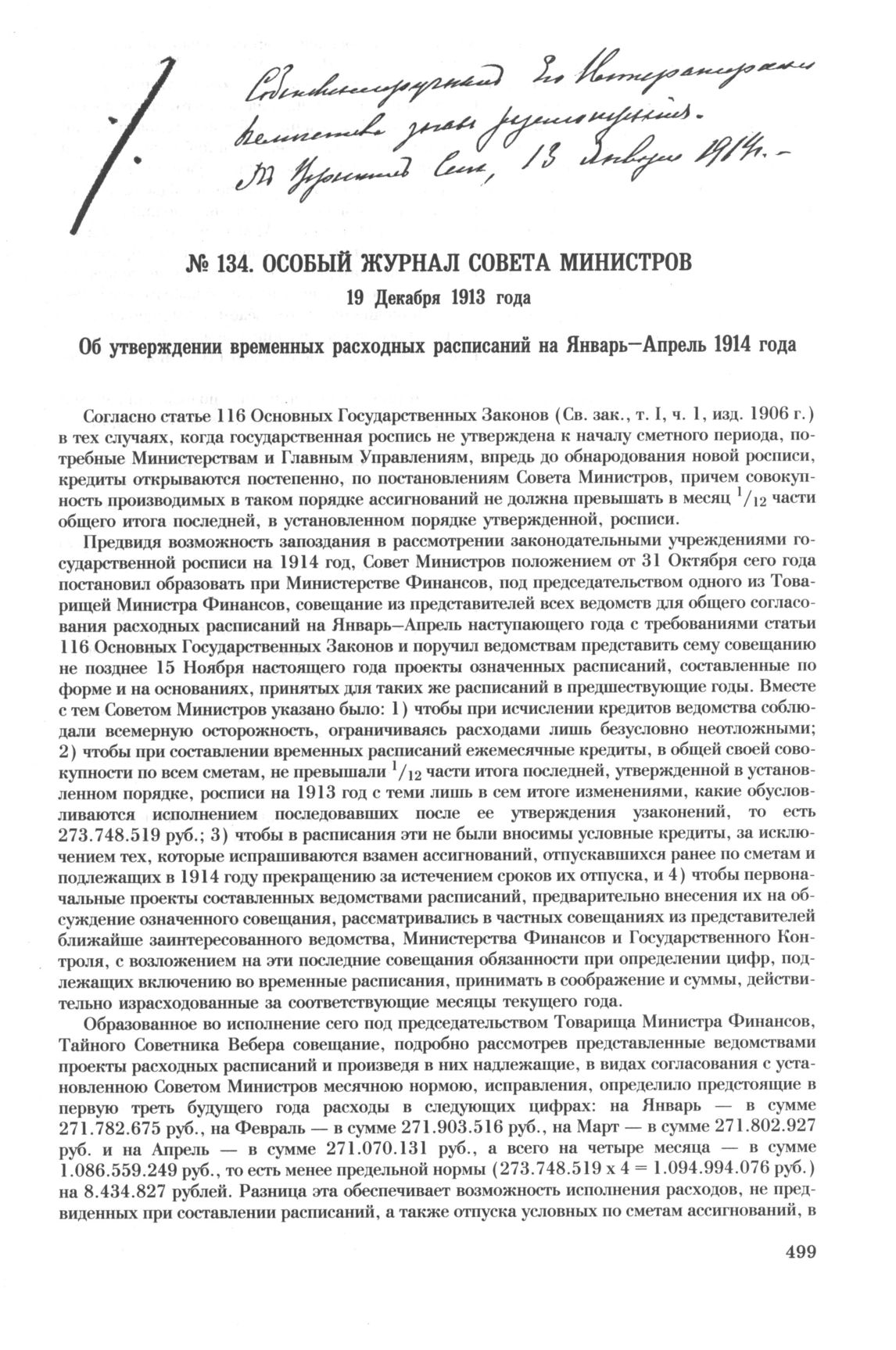 Особый журнал совета министров. 19 Декабря 1913 года. Об утверждении временных расходных расписаний на Январь—Апрель 1914 года