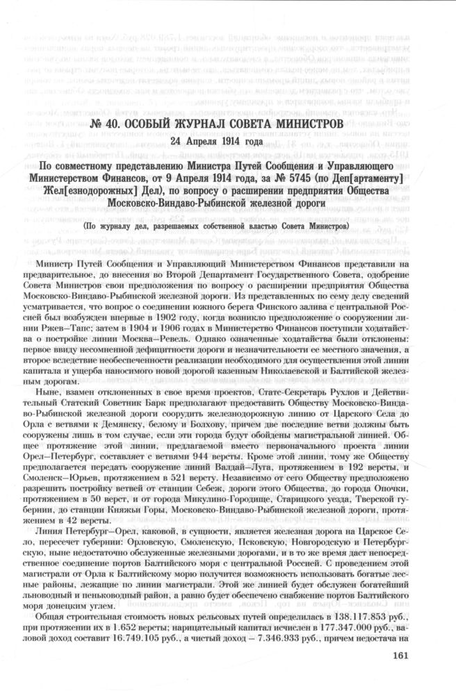 Особый журнал совета министров. 24 Апреля 1914 года. По совместному представлению Министра Путей Сообщения и Управляющего Министерством Финансов, от 9 Апреля 1914 года, за № 5745 (по Деп[артаменту] Жел[езнодорожных] Дел), по вопросу о расширении предприятия Общества Московско-Виндаво-Рыбинской железной дороги // РГИА. Ф. 1265. Оп. 20. Д. 71. Л. 74-77; Ф. 1276. Оп. 8. Д. 256.