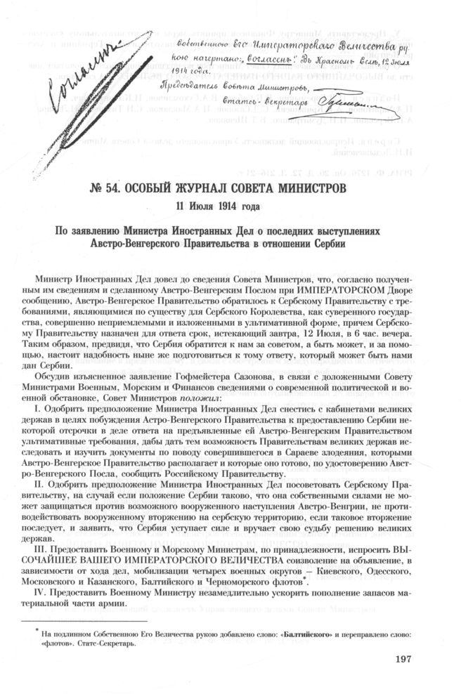 Особый журнал совета министров. 11 Июля 1914 года. По заявлению Министра Иностранных Дел о последних выступлениях Австро-Венгерского Правительства в отношении Сербии