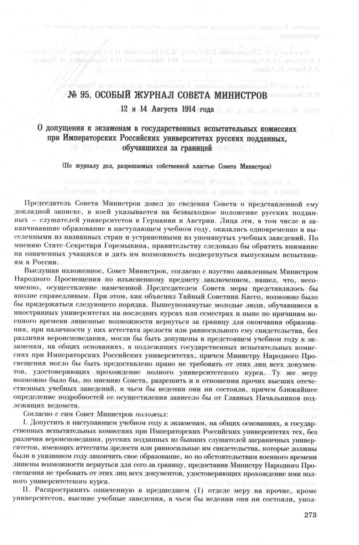 Особый журнал совета министров. 12 и 14 Августа 1914 года. О допущении к экзаменам в государственных испытательных комиссиях при Императорских Российских университетах русских подданных, обучавшихся за границей