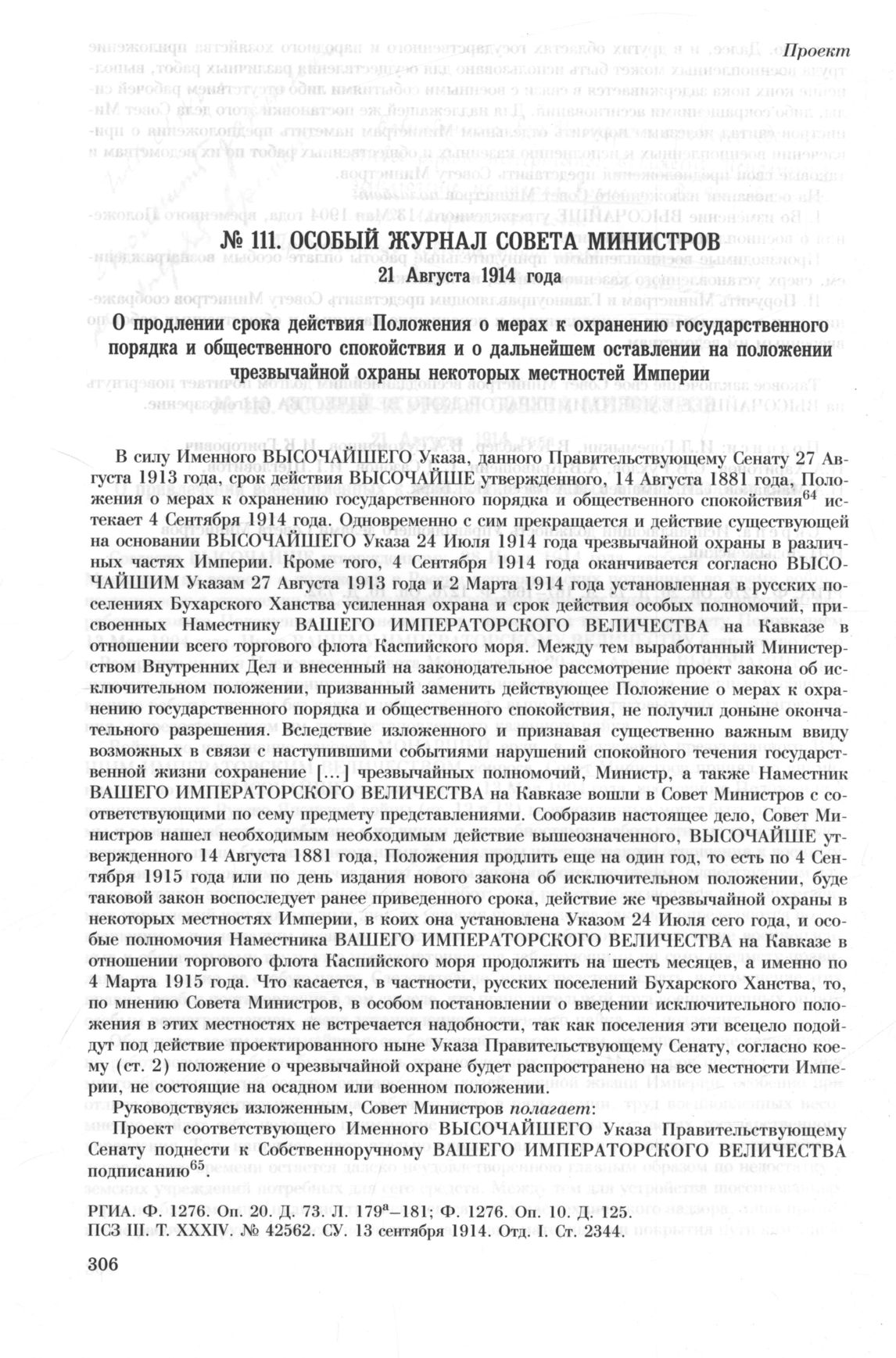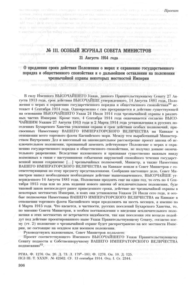 Особый журнал совета министров. 21 Августа 1914 года. О продлении срока действия Положения о мерах к охранению государственного порядка и общественного спокойствия и о дальнейшем оставлении на положении чрезвычайной охраны некоторых местностей Империи // РГИА. Ф. 1276. Оп. 20. Д. 73. Л. 179а—181; Ф. 1276. Оп. 10. Д. 125; ПСЗ III. Т. XXXIV. № 42562. СУ. 13 сентября 1914. Отд. I. Ст. 2344.