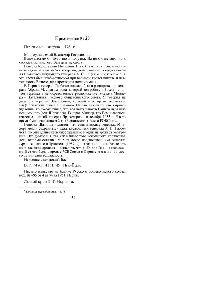 Генерал Шатилов полагает, что если в архиве генерала Миллера могли сохраниться дела, касающиеся генерала К. И. Глобачева, то они сданы на вечное хранение в один из архивов эмиграции. Это думаю и я, так как в числе того небольшого количества дел, которые остались мне от моего предшественника генерала Архангельского в Брюсселе (1957 г.) - этих дел н е т. Разыскать их в сданных архивах и выделить что-либо для Вас - невозможно. Все что было в архиве РОВСоюза в Париже с д а н о до моего вступления в должность.