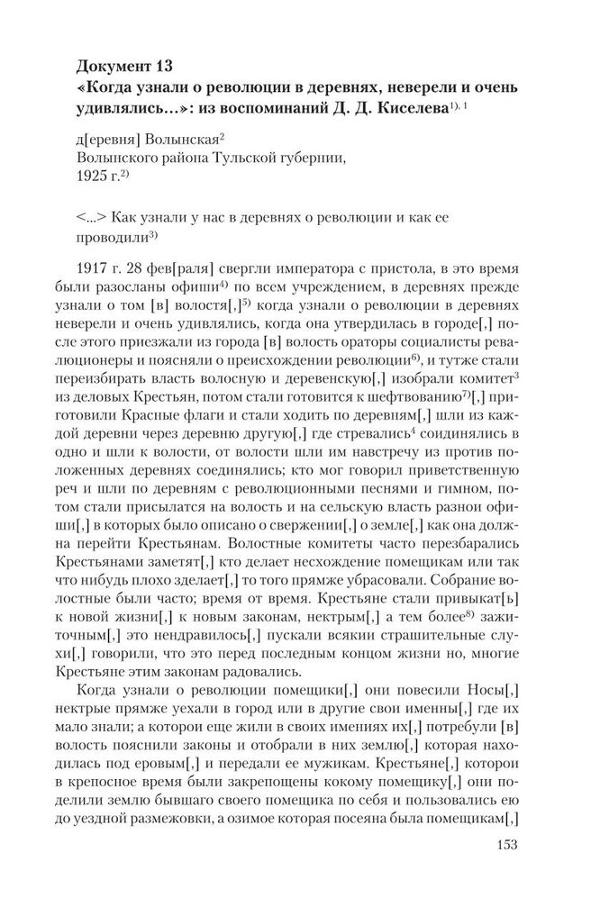 «Когда узнали о революции в деревнях, неверели и очень удивлялись…» : из воспоминаний Д. Д. Киселева, д[еревня] Волынская Волынского района Тульской губернии, 1925 г. // РГАЭ. Ф. 396. Оп. 3. Д. 765. Подлинник. Рукопись. Л. 4 об. – 8 об.