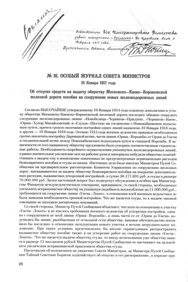 Особый журнал совета министров. 10 Января 1917 года. Об отпуске средств на выдачу обществу Московско-Киево—Воронежской железной дороги пособия на сооружение новых железнодорожных линий // РГИА. Ф. 1276. Оп. 20. Д. 125. Л. 32-34 об.