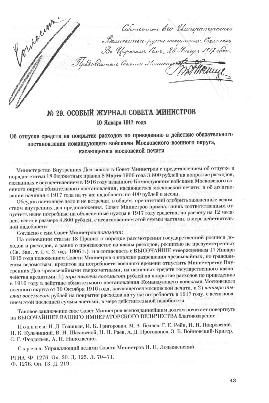 Особый журнал совета министров. 10 Января 1917 года. Об отпуске средств на покрытие расходов по приведению в действие обязательного постановления командующего войсками Московского военного округа, касающегося московской печати // РГИА. Ф. 1276. Оп. 20. Д. 125. Л. 70-71. Ф. 1276. Оп. 13. Д. 219.