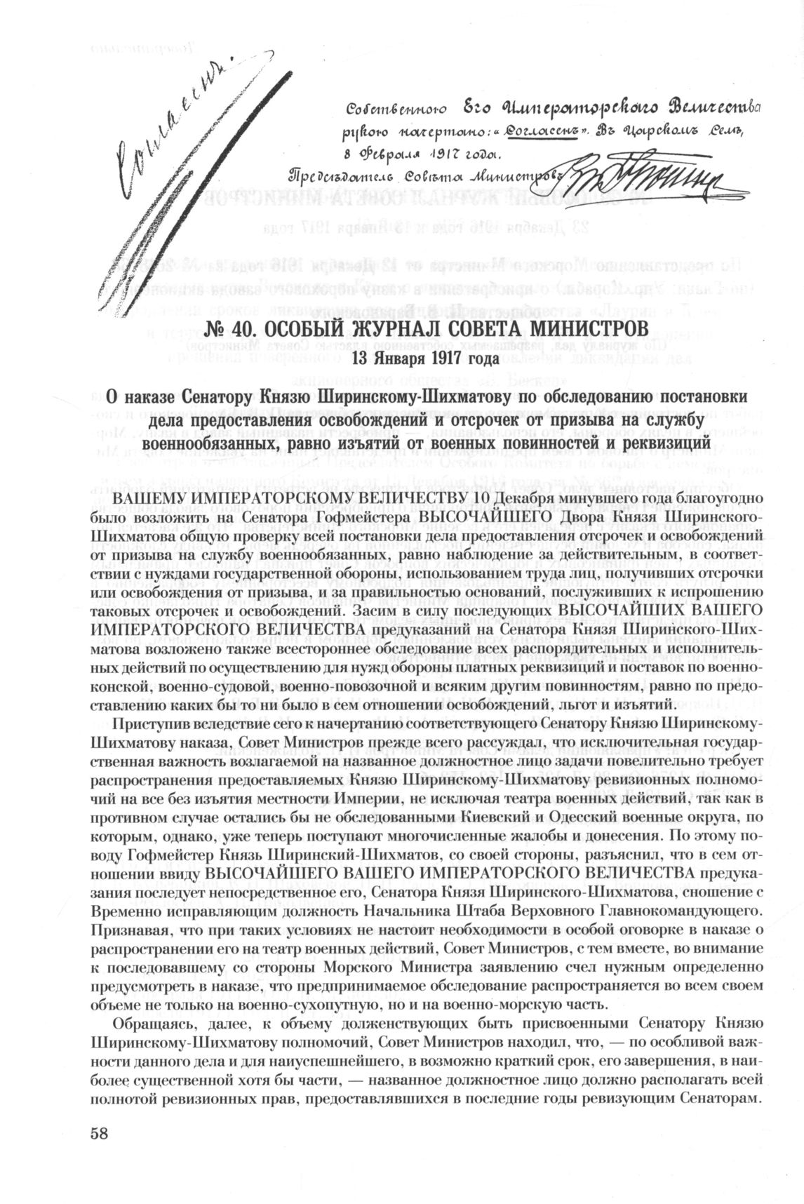 Особый журнал совета министров. 13 Января 1917 года. О наказе Сенатору Князю Ширинскому-Шихматову по обследованию постановки дела предоставления освобождений и отсрочек от призыва на службу военнообязанных, равно изъятий от военных повинностей и реквизиций