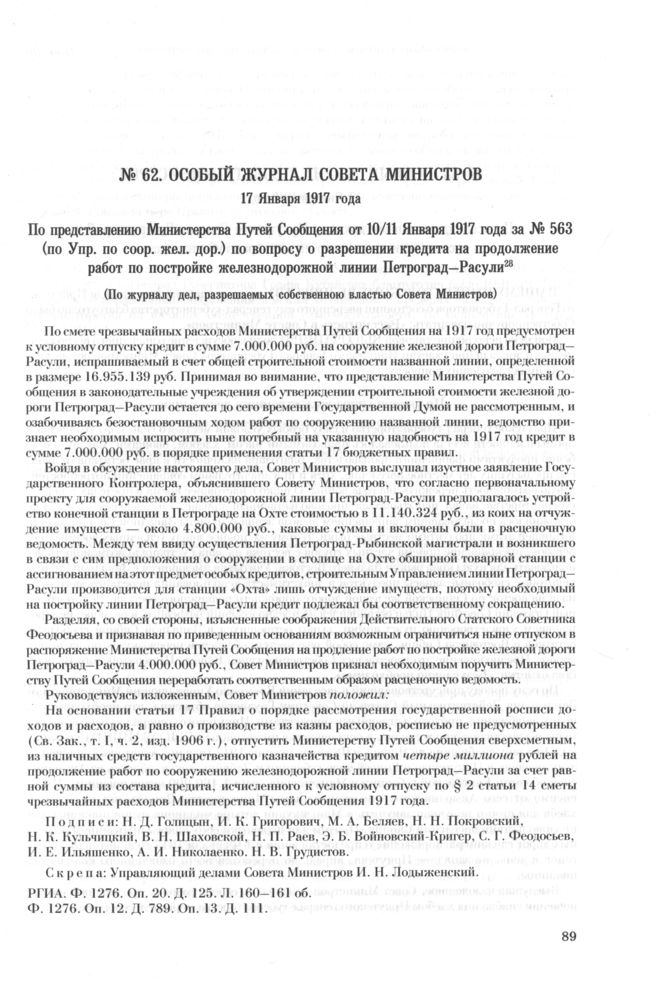 Особый журнал совета министров. 17 Января 1917 года. По представлению Министерства Путей Сообщения от 10/11 Января 1917 года за № 563 (по Упр. по coop. жел. дор.) по вопросу о разрешении кредита на продолжение работ по постройке железнодорожной линии Петроград-Расули // РГИА. Ф. 1276. Оп. 20. Д. 125. Л. 160-161 об. Ф. 1276. Оп. 12. Д. 789. Оп. 13. Д. 111.