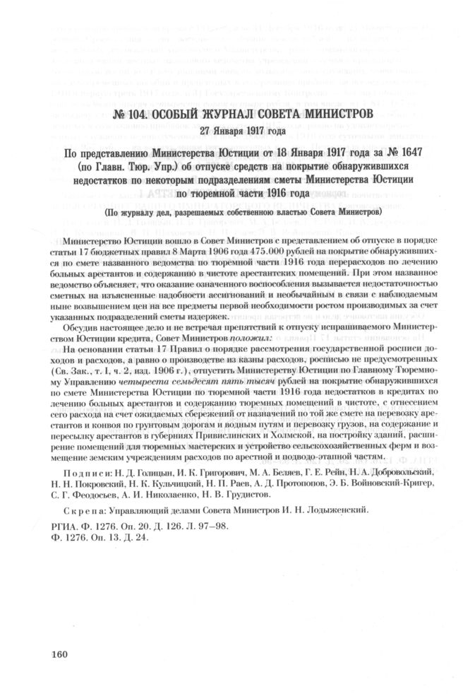 Особый журнал совета министров. 27 Января 1917 года. По представлению Министерства Юстиции от 18 Января 1917 года за № 1647 (по Главн. Тюр. Упр.) об отпуске средств на покрытие обнаружившихся недостатков по некоторым подразделениям сметы Министерства Юстиции по тюремной части 1916 года // РГИА. Ф. 1276. Оп. 20. Д. 126. Л. 97-98. Ф. 1276. Оп. 13. Д. 24.
