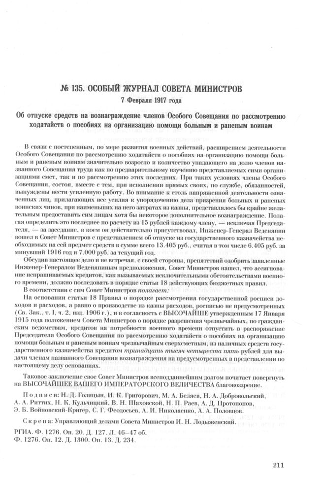 Особый журнал совета министров. 7 Февраля 1917 года. Об отпуске средств на вознаграждение членов Особого Совещания по рассмотрению ходатайств о пособиях на организацию помощи больным и раненым воинам // РГИА. Ф. 1276. Оп. 20. Д. 127. Л. 46-47 об. Ф. 1276. Оп. 12. Д. 1300. Оп. 13. Д. 234.