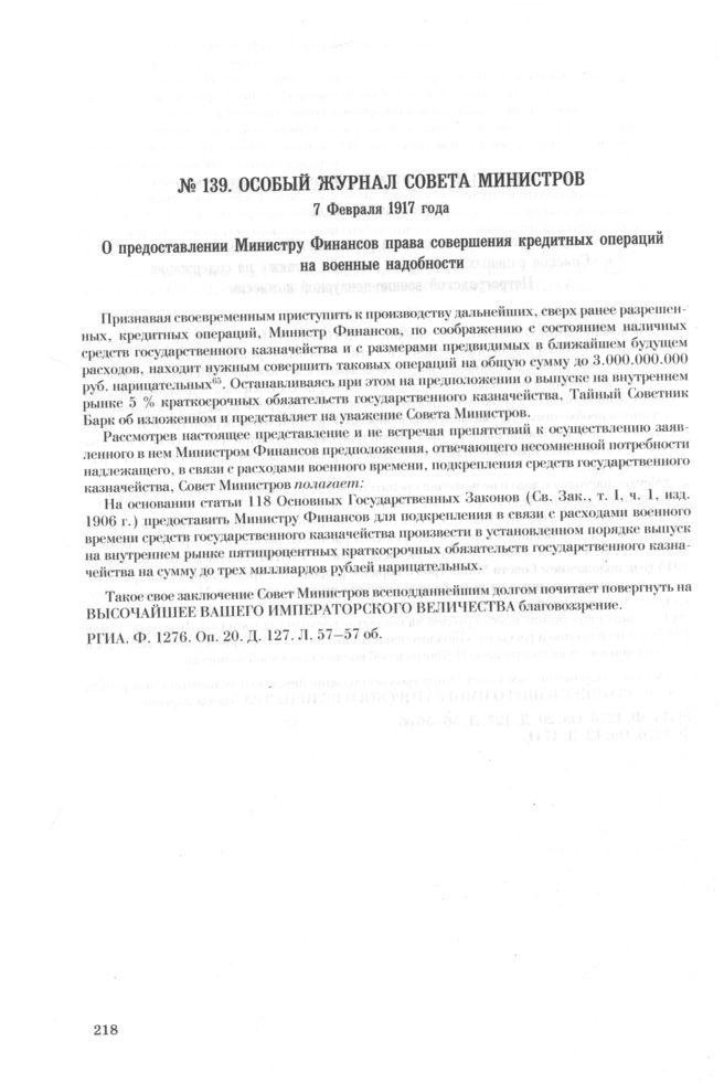 Особый журнал совета министров. 7 Февраля 1917 года. О предоставлении Министру Финансов права совершения кредитных операций на военные надобности // РГИА. Ф. 1276. Оп. 20. Д. 127. Л. 57-57 об.