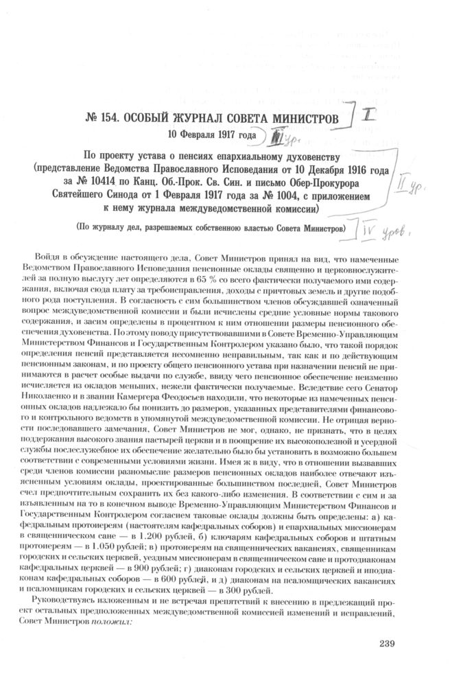Особый журнал совета министров. 10 Февраля 1917 года. По проекту устава о пенсиях епархиальному духовенству (представление Ведомства Православного Исповедания от 10 Декабря 1916 года за № 10414 по Канц. Об.-Прок. Св. Син. и письмо Обер-Прокурора Святейшего Синода от 1 Февраля 1917 года за № 1004, с приложением к нему журнала междуведомственной комиссии)