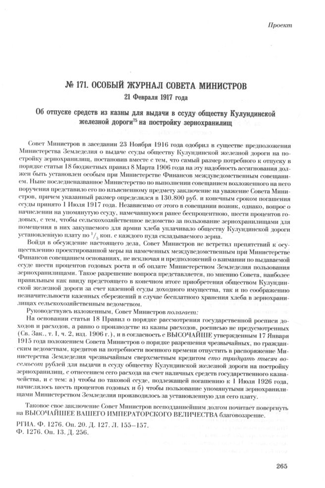 Особый журнал совета министров. 21 Февраля 1917 года. Об отпуске средств из казны для выдачи в ссуду обществу Кулундинской железной дороги на постройку зернохранилищ // РГИА. Ф. 1276. Оп. 20. Д. 127. Л. 155-157. Ф. 1276. Оп. 13. Д. 256.