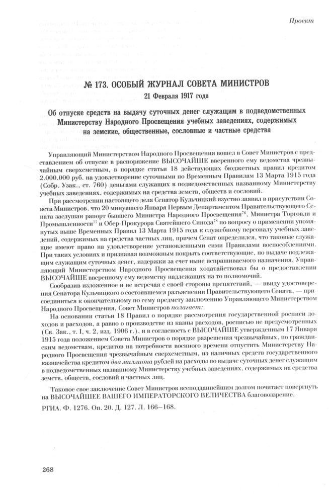 Особый журнал совета министров. 21 Февраля 1917 года. Об отпуске средств на выдачу суточных денег служащим в подведомственных Министерству Народного Просвещения учебных заведениях, содержимых на земские, общественные, сословные и частные средства // РГИА. Ф. 1276. Оп. 20. Д. 127. Л. 166-168.