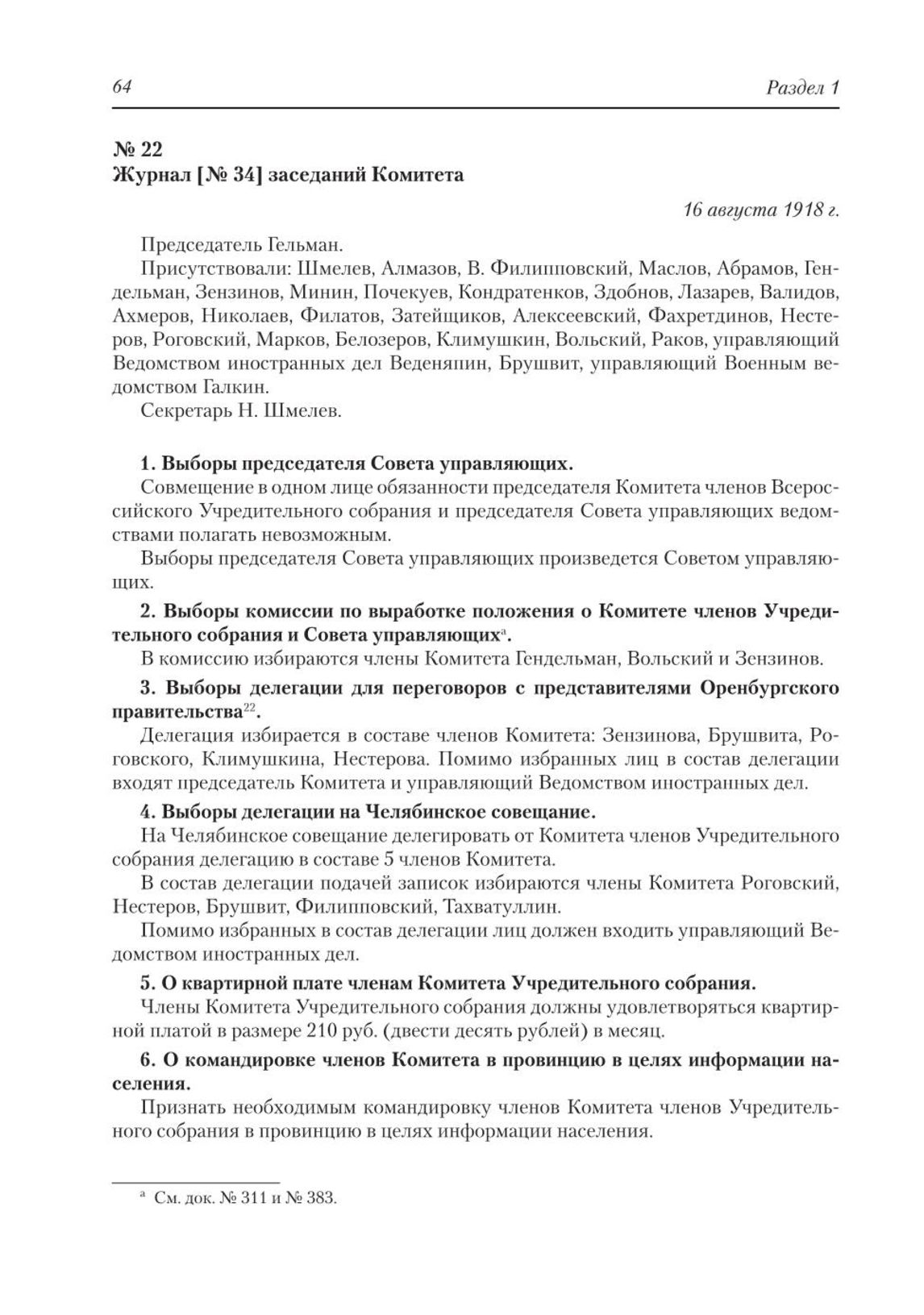 Журнал [№ 34] заседаний Комитета. 16 августа 1918 г. // ГА РФ. Ф. Р-670. Оп. 1. Д. 1. Л. 7–8; Ф. Р-667. Оп. 1. Д. 23. Л. 250–251. Заверенные копии.
