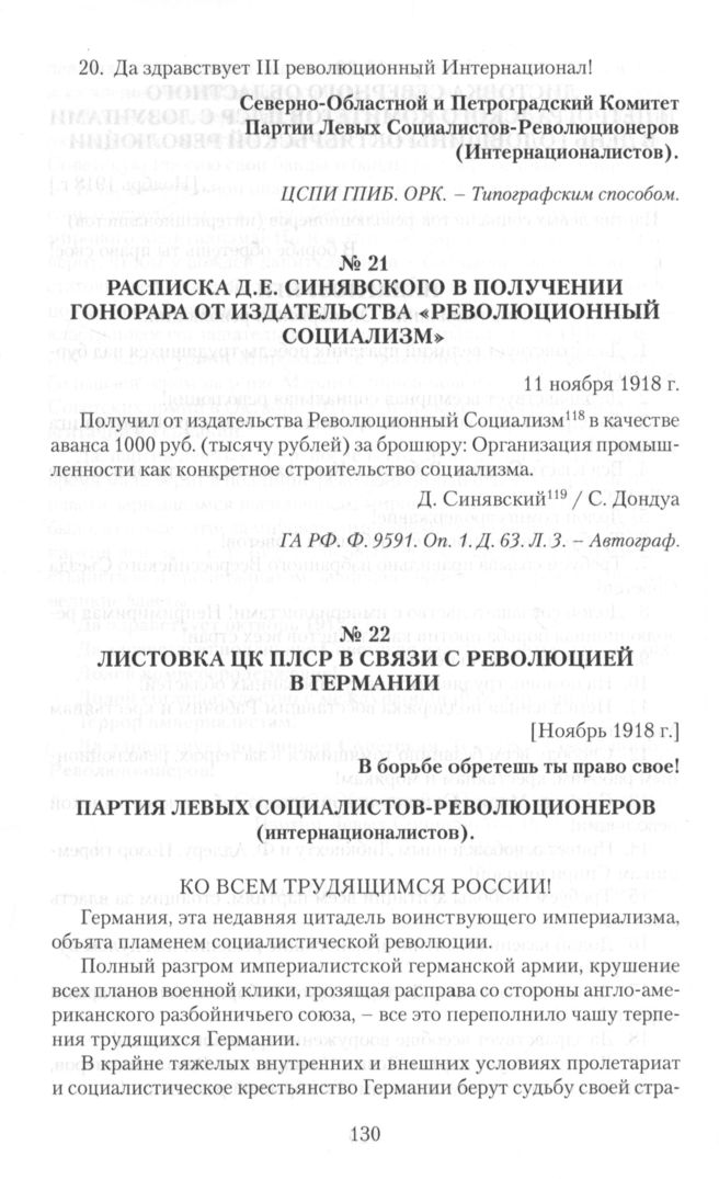 Товарищ Александрович, расстрелянный большевиками, тов. Донской, повешенный германским командованием в Киеве, заточенная в Кремле М.А. Спиридонова и сотни расстрелянных рабочих и матросов, членов партии левых соц.-рев., в России и на Украине - вот наши жертвы за эту тактику, которую сейчас рекомендуют германскому пролетариату и большевики.