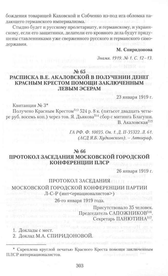 - 1. ↑ Это, вероятно, один из первых по времени документов, относящихся к «краснокрестной» работе левых эсеров по оказанию помощи заключенным товарищам ввиду не прекращавшихся арестов (в Петрограде, Минске, Пскове, Н. Новгороде, Рязани и иных местах), хотя пока еще и не столь масштабных. Детальные подробности о работе партийной краснокрестной структуры в этот период неизвестны, за исключением того, что одной из основных руководительниц этого направления деятельности являлась жена К.А. Коренева (Корнилова) С.А. Бродская (Бродская- Коренева). Насколько можно понять из материалов дела Я. Худковского, сбор средств осуществлялся с продаж на митингах «больших» портретов и открыток с изображением М.А. Спиридоновой, И.П. Каляева, Б.М. Донского.