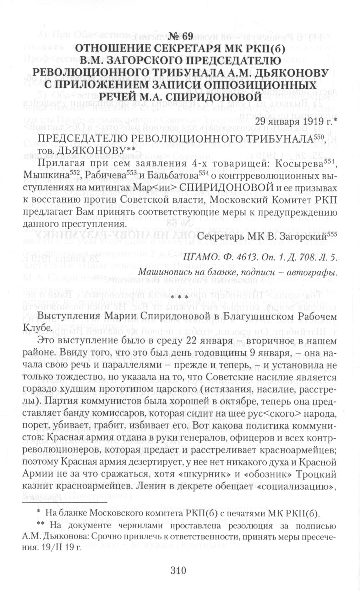 Отношение секретаря МК РКП(б) В.М. Загорского председателю революционного трибунала А.М. Дьяконову приложением записи оппозиционных речей М.А. Спиридоновой. 29 января 1919 г. Речи