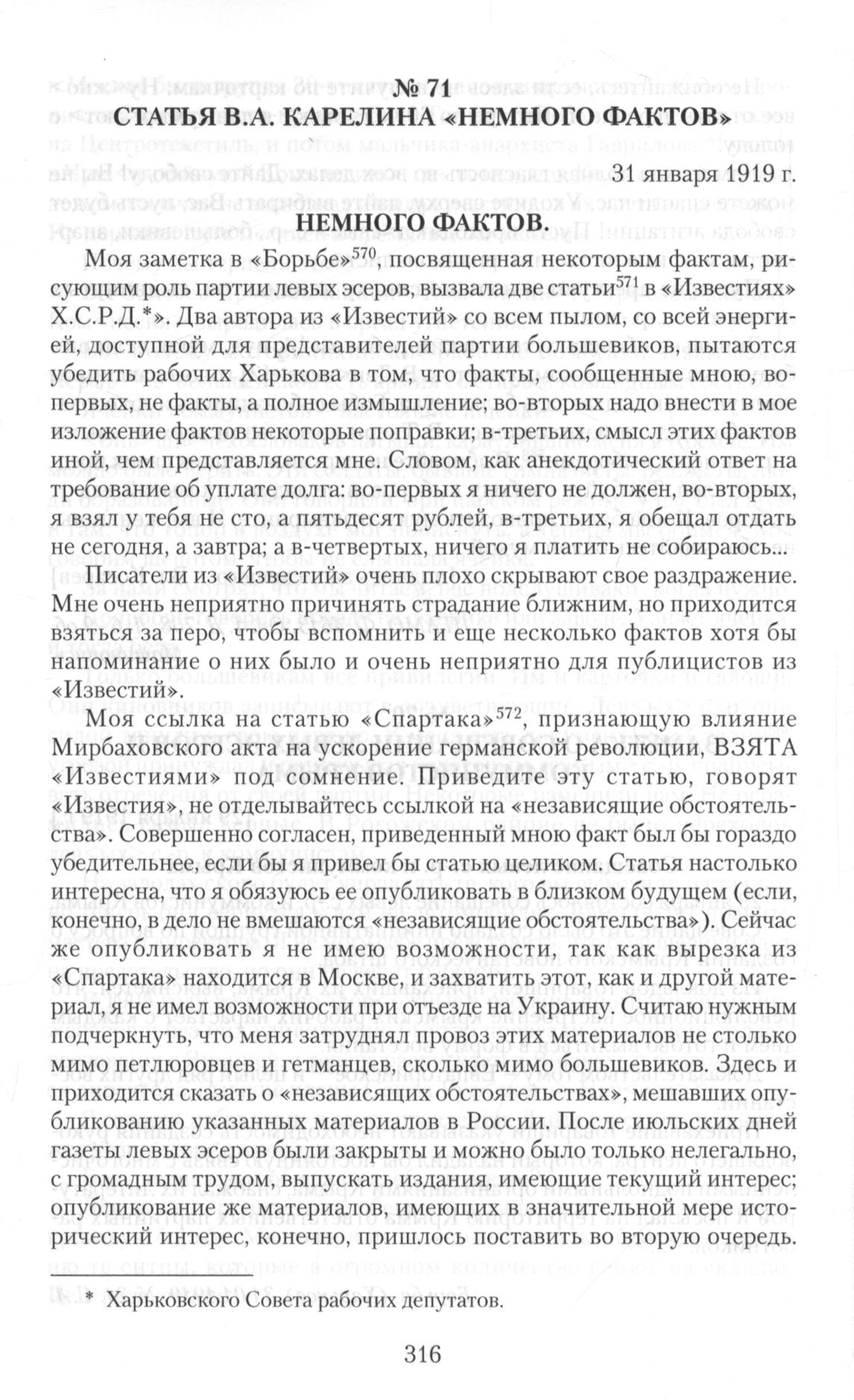 Моя заметка в «Борьбе» [1] , посвященная некоторым фактам, рисующим роль партии левых эсеров, вызвала две статьи [2] в «Известиях» Х.С.Р.Д. [a] ». Два автора из «Известий» со всем пылом, со всей энергией, доступной для представителей партии большевиков, пытаются убедить рабочих Харькова в том, что факты, сообщенные мною, вопервых, не факты, а полное измышление; во-вторых надо внести в мое изложение фактов некоторые поправки; в-третьих, смысл этих фактов иной, чем представляется мне. Словом, как анекдотический ответ на требование об уплате долга: во-первых я ничего не должен, во-вторых, я взял у тебя не сто, а пятьдесят рублей, в-третьих, я обещал отдать не сегодня, а завтра; а в-четвертых, ничего я платить не собираюсь...