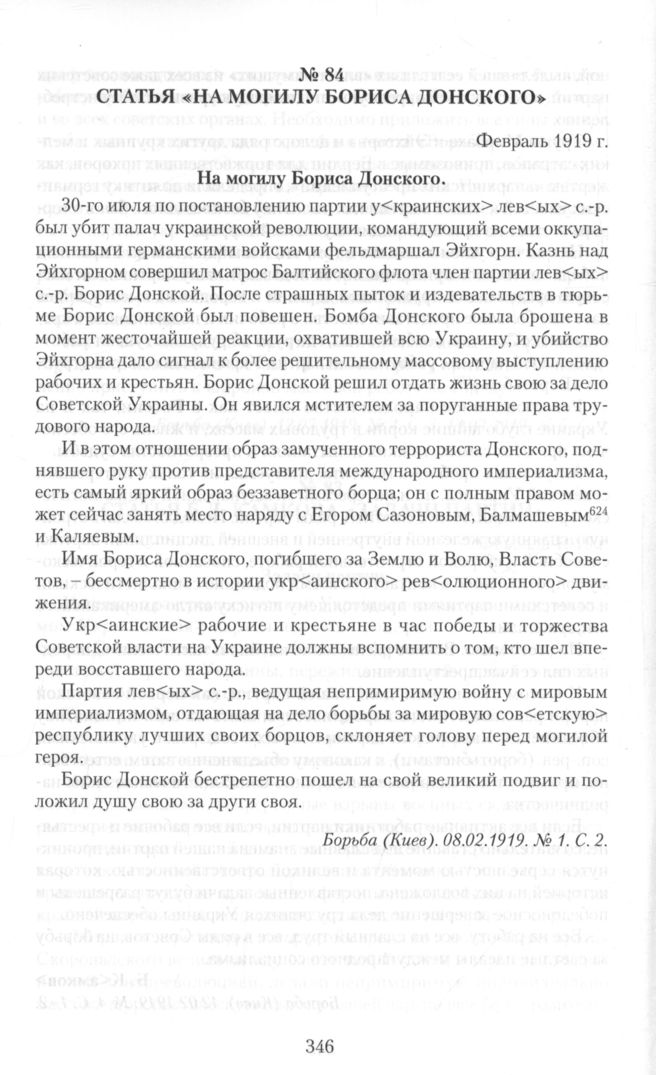 30-го июля по постановлению партии у<краинских> лев<ых> с.-р. был убит палач украинской революции, командующий всеми оккупационными германскими войсками фельдмаршал Эйхгорн. Казнь над Эйхгорном совершил матрос Балтийского флота член партии лев<ых> с.-р. Борис Донской. После страшных пыток и издевательств в тюрьме Борис Донской был повешен. Бомба Донского была брошена в момент жесточайшей реакции, охватившей всю Украину, и убийство Эйхгорна дало сигнал к более решительному массовому выступлению рабочих и крестьян. Борис Донской решил отдать жизнь свою за дело Советской Украины. Он явился мстителем за поруганные права трудового народа.