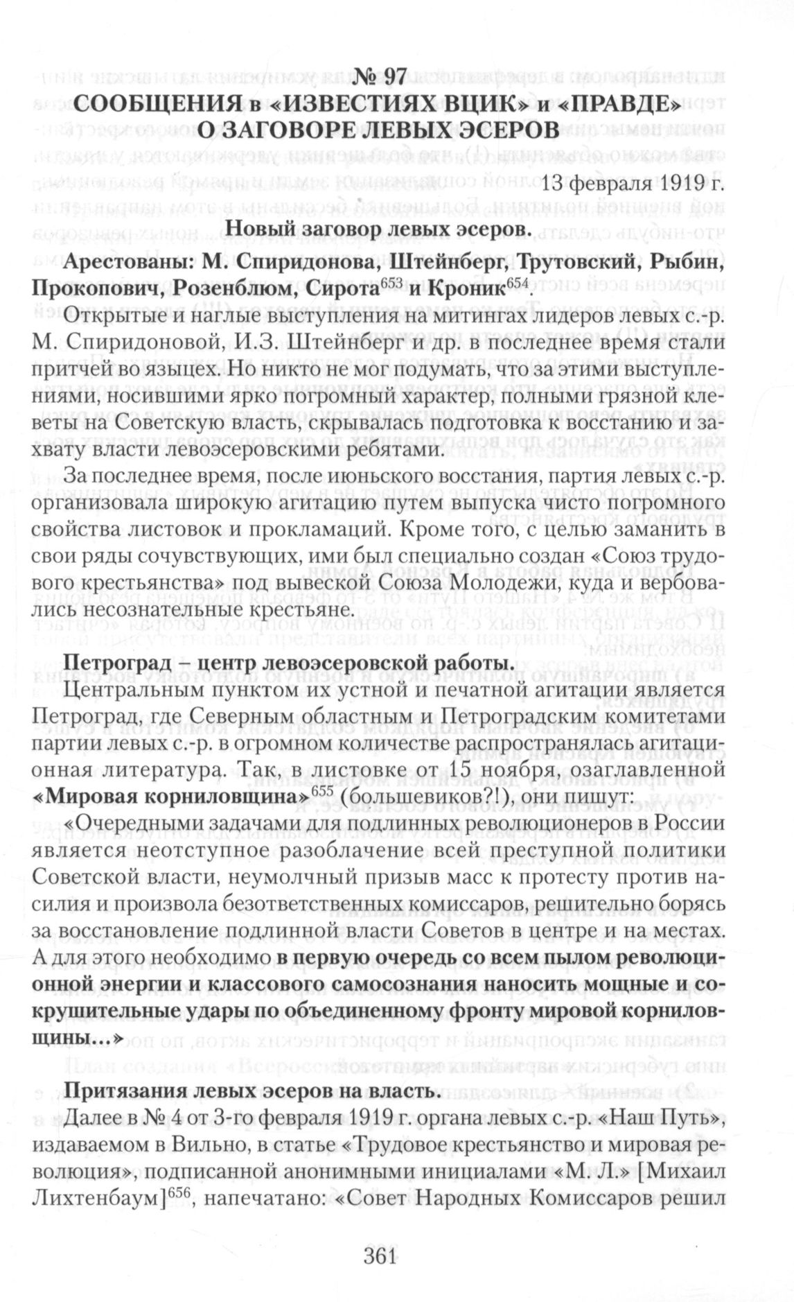 Далее в № 4 от 3-го февраля 1919 г. органа левых с.-р. «Наш Путь», издаваемом в Вильно, в статье «Трудовое крестьянство и мировая революция», подписанной анонимными инициалами «М. Л.» [Михаил Лихтенбаум] [4] , напечатано: «Совет Народных Комиссаров решил идти напролом: в деревни посылают для усмирения латышские и интернациональные батальоны. Описание происходящих там ужасов почти немыслимо. Только неорганизованностью трудового крестьянства можно объяснить (!), что большевики удерживаются у власти. Деревня требует полной социализации земли и прямой революционной внешней политики. Большевики бессильны в этом направлении что-нибудь сделать, и могут лишь насаждать только... новых ревизоров (?!), но социальная революция не этим разрешается. Необходима перемена всей системы. Большевики делают «глазки» правым эсерам, но это бесполезно. Только немедленный переход (!!!) власти к нашей партии (!!) может спасти положение.