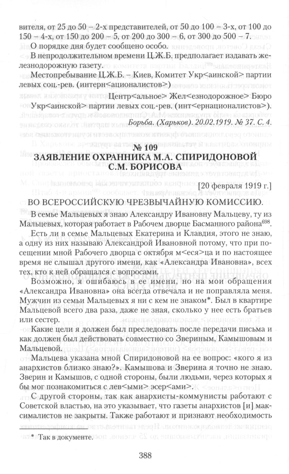 Мальцева указана мной Спиридоновой на ее вопрос: «кого я из анархистов близко знаю?». Камышова и Зверина я точно не знаю. Зверин и Камышов, с одной стороны, были людьми, через которых я бы мог познакомиться с лев<ыми> эсер<ами>.