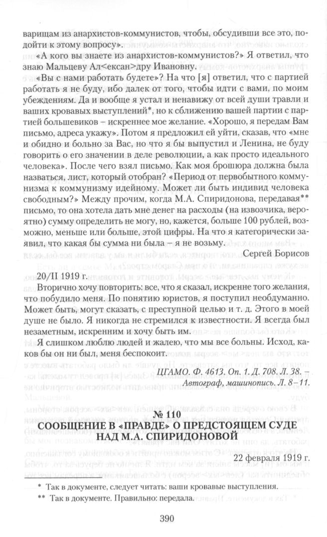 Сообщение в «Правде» о предстоящем суде над М.А. Спиридоновой. 22 февраля 1919 г.