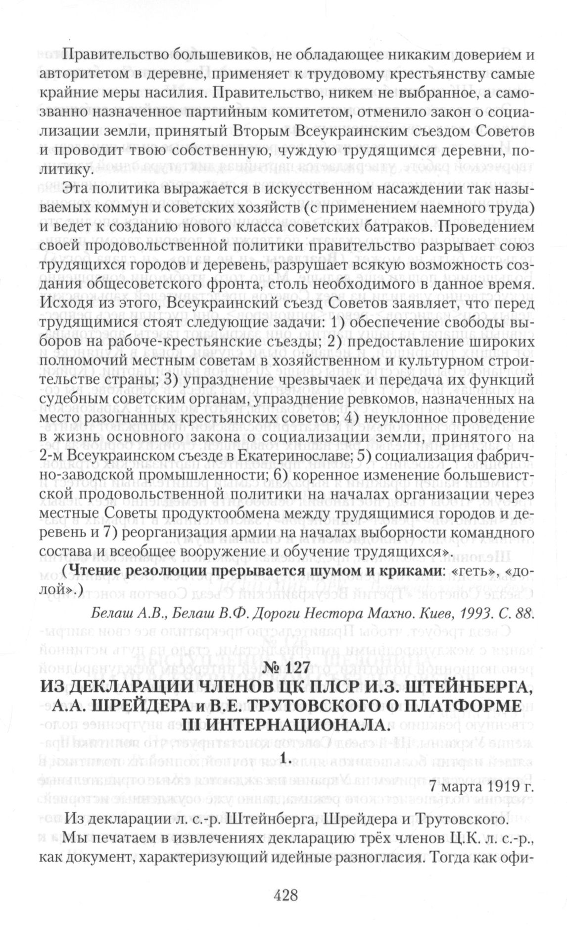 ИЗ ДЕКЛАРАЦИИ ЧЛЕНОВ ЦК ПЛСР И.З. ШТЕЙНБЕРГА, А.А. ШРЕЙДЕРА и В.Е. ТРУТОВСКОГО О ПЛАТФОРМЕ III ИНТЕРНАЦИОНАЛА.