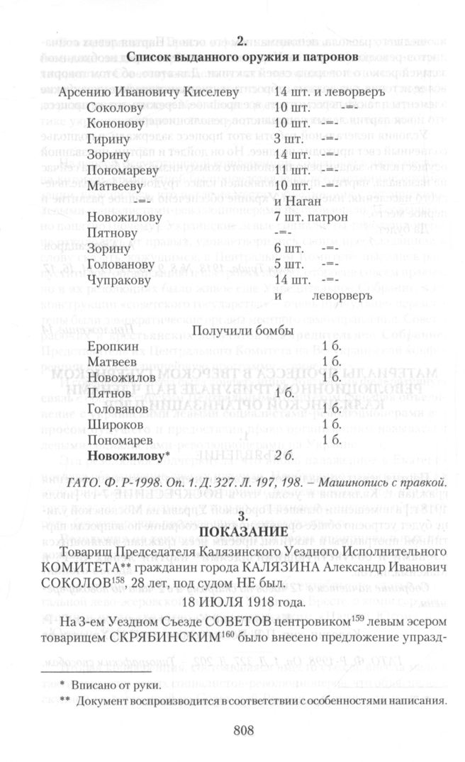 На 3-ем Уездном Съезде СОВЕТОВ центровиком [2] левым эсером товарищем СКРЯБИНСКИМ [3] было внесено предложение упразднить СОВЕТ НАРОДНЫХ КОМИССАРОВ, что и было принято и занесено в протокол. Товарищи большевики коммунисты и, в частности, я были бессильны предотвратить вышесказанное, так как нас было меньшинство. Указанным СЪЕЗДОМ я от партии большевиков-коммунистов был проведен в члены Калязинского Уездного Исполнительного Комитета. В первом заседании Уездного Исполнительного при распределении должностей между членами по комиссариатам, председатель партии левых эсеров товарищ ШИРОКОВ [4] от партии УЛЬТИМАТИВНО заявил, что председатель УЕЗДНОГО ИСПОЛКОМА, комиссары: Военный, Внутренних дел, Земельный и Продовольствия - НАШИ. Так как МЫ, большевики, имели в Калязинском Уездном Исполнительном Комитете только ЧЕТЫРЕ места, а левые эсеры ТРИНАДЦАТЬ, то нам пришлось согласиться. Председатель ИСПОЛКОМА (левый эсер [5] ), был не на своем месте, как ничего незнайка, а секретарь (левый эсер) - консерватор [6] , а потому я им не доверял. Председатель Исполкома товарищ ЧУПРАКОВ, я, как товарищ председателя, и секретарь товарищ ЖУРАВЛЕВ составляли президиум Уездного Исполнительного Комитета. Одно время я заявил, что на всех исходящих бумагах должна быть и моя подпись, как товарища председателя, на что мне председатель ЧУПРАКОВ заявил, что это не нужно, это лишнее, после же со мной согласился. 9 июля придя на занятие в Уездный СОВДЕП я встретился с товарищем КОЗЛОВЫМ [7] (большевик-коммунист), который спросил меня: ИЗВЕСТНО ЛИ ТЕБЕ, ТОВАРИЩ СОКОЛОВ, ЧТО НАВЕРХУ РАСКОЛ И УБИТ МИРБАХ? На что я ответил отрицательно, что не известно. Товарищ Козлов предложил мне спросить у председателя ИСПОЛКОМА товарища ЧУПРАКОВА все телеграммы, полученные за 7-е и 8-е ИЮЛЯ, как праздничные дни. Войдя в кабинет председателя, я спросил: ТОВАРИЩ ЧУПРАКОВ, ЕСТЬ ТЕЛЕГРАММЫ, ПОЛУЧЕННЫЕ ЗА ВОСКРЕСЕНЬЕ и ПОНЕДЕЛЬНИК? На что мне председатель Чупраков твердо ответил, что таковых не было. Вернувшись к товарищу Козлову, я пояснил, что Чупраков сказал, что телеграмм НЕ БЫЛО. На что товарищ Козлов ответил мне, что председатель врет и телеграммы скрывает. Я снова пошел к председателю и заявил, чтобы он дал мне все телеграммы, полученные за 7-е и 8-е ИЮЛЯ, на что председатель Чупраков вновь ответил мне, что таковых НЕ БЫЛО. Я вторично вернулся к товарищу Козлову и сказал слова председателя, на что Козлов сказал мне: ИДИ ТРЕБУЙ И ИЩИ ТЕЛЕГРАММЫ САМ! Когда я, в третий раз подойдя к председателю Чупракову, спросил дать мне все телеграммы за 7-е и 8-е ИЮЛЯ, он в третий раз ответил, что телеграмм НЕ БЫЛО, но при этом указал на телеграмму, только что полученную и лежащую на столе нераспечатанной. При этом присутствовал Комиссар Финансов Пуминов (лев<ый> эсер) [8] . В телеграмме было сказано, что Москве, Твери спокойно, Рыбинске тревожно. Тут явились члены Кашинского Уездного СОВДЕПА (большевики) и пожелали сделать соединенное заседание, что и было сделано. На соединенном заседании председатель Кашинского Уездного СОВДЕПА товарищ Потемкин [9] словесно познакомил нас о заговоре левых эсеров и убийстве германского консула Мирбаха. Я взял слово и в присутствии всех сказал, что это для нас новость, у нас телеграмм никаких нету. Тогда секретарь Журавлев принес все телеграммы, и мы, большевики, только тут и узнал