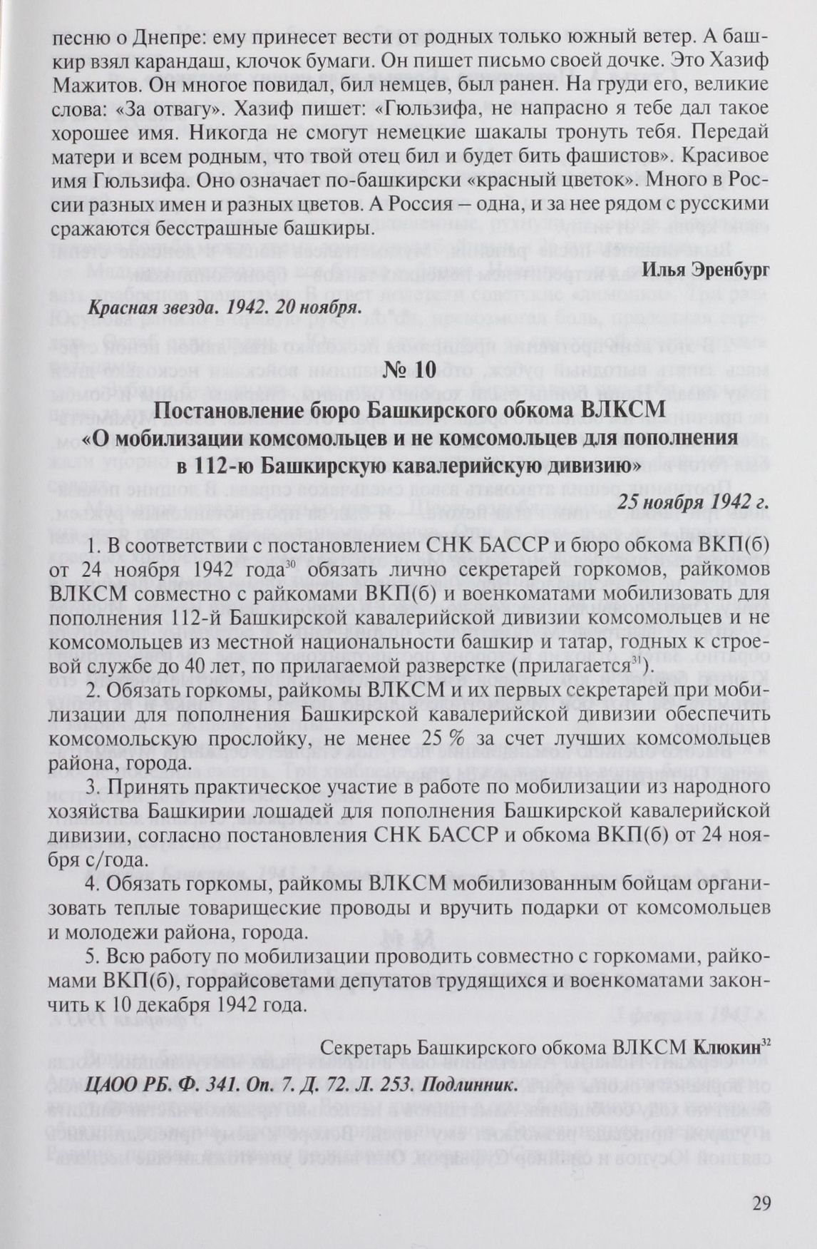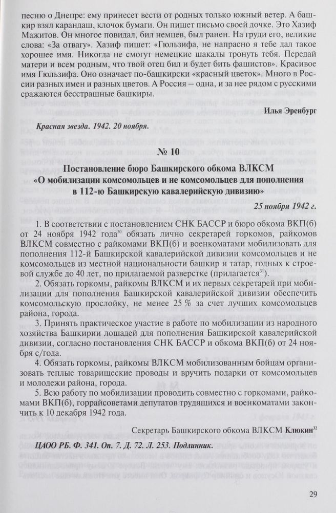Постановление бюро Башкирского обкома ВЛКСМ «О мобилизации комсомольцев и не комсомольцев для пополнения в 112-ю Башкирскую кавалерийскую дивизию». 25 ноября 1942 г. // ЦАОО РБ. Ф. 341. Оп. 7. Д. 72. Л. 253. Подлинник.