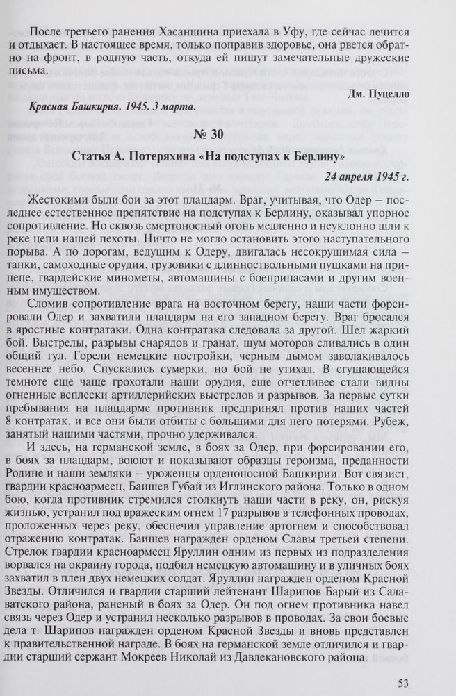 Статья А. Потеряхина «На подступах к Берлину». 24 апреля 1945 г. // Красная Башкирия. 1945. 24 апреля.