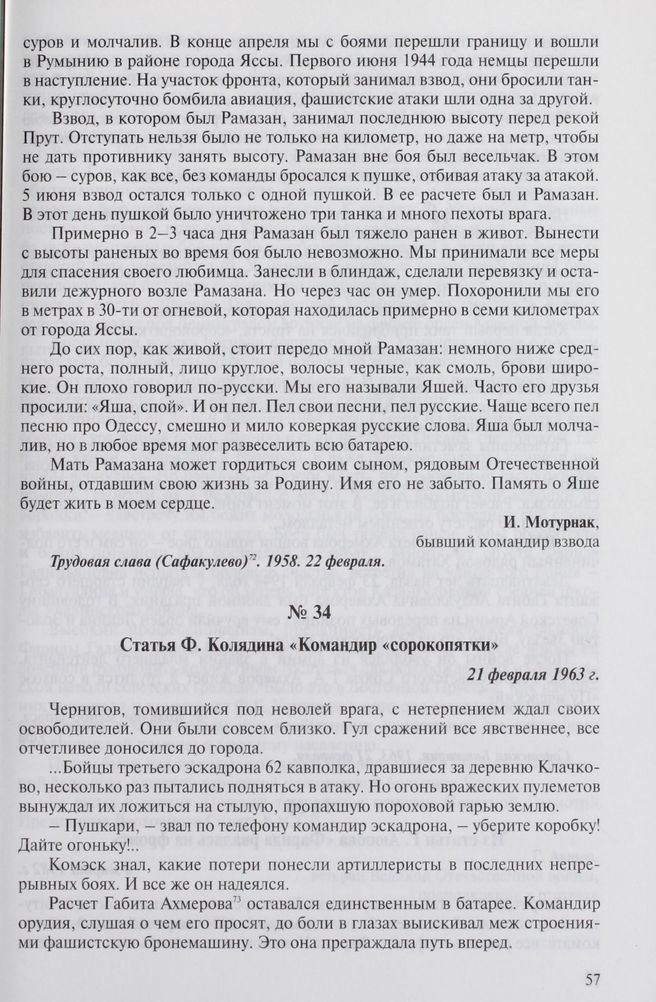 Статья Ф. Колядина «Командир «сорокопятки». 21 февраля 1963 г. // Советская Башкирия. 1963. 21 февраля.