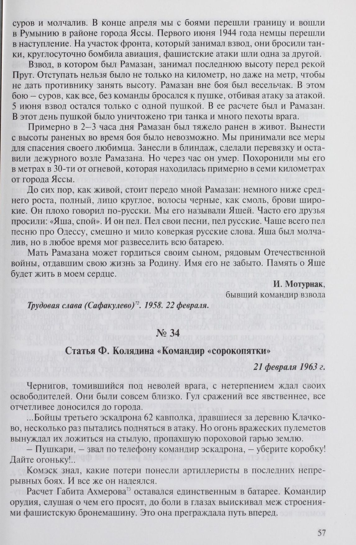 Статья Ф. Колядина «Командир «сорокопятки». 21 февраля 1963 г.