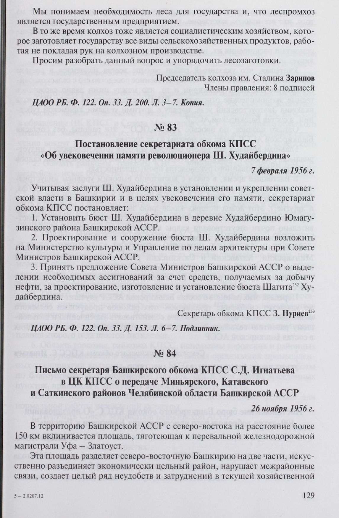 Письмо секретаря Башкирского обкома КПСС С.Д. Игнатьева в ЦК КПСС о передаче Миньярского, Катавского и Саткинского районов Челябинской области Башкирской АССР. 26 ноября 1956 г. // ЦАОО РБ. Ф. 122. Оп. 33. Д. 225. Л. 139-141. Отпуск.